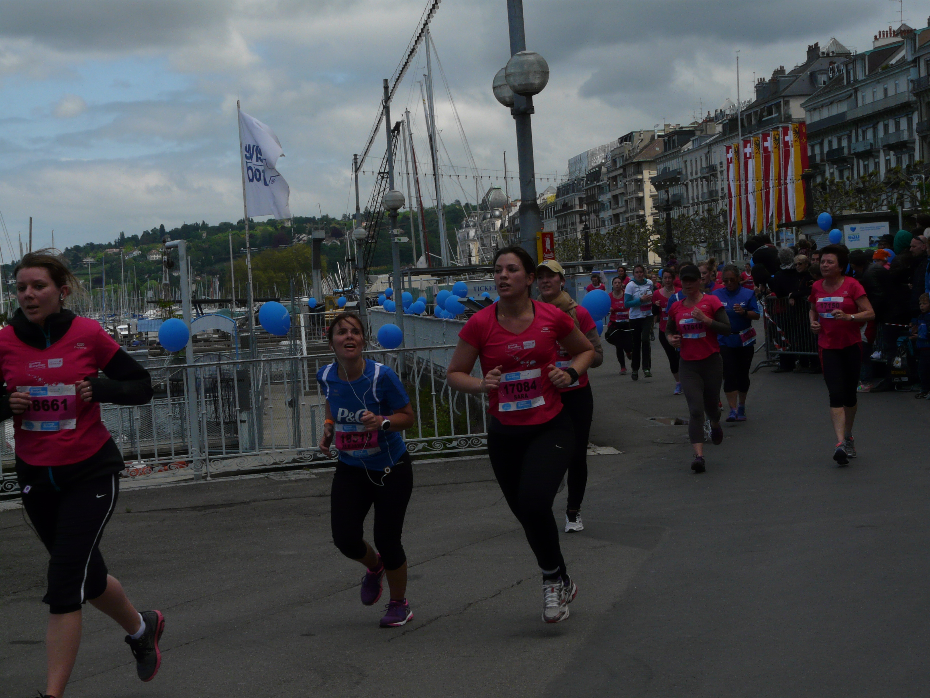 Mais il en aurait fallu plus pour décourager notre groupe! à moins que Stéphanie, annoncée sur la Genevoise, n’y ait vu là, matière à renoncer, car, bien qu’inscrite sur le 5KM de Samedi après midi, nous ne l’aperçûmes point au départ et encore moins à l’arrivée! par contre, Sara, confrontée à sa première épreuve de course à pied (en terme de compétitions elle a côtoyé le haut niveau des canassons tout de même!) va vivre une première pleine de bonheur, puisque elle arborait le célèbre sourire banane: emblème de nos troupes à l’arrivée, dommage que sa modestie la fit partir dans le dernier sas car elle n’eût de cesse de doubler et doubler encore pour terminer en 26’05 » 84è/358 !!Dimanche matin la Declercq’s family, postée au bord du lac guettait, frigorifiée, l’arrivée de nos sympathiques Pascale et François, le premier nommé passa en nous disant: « je ne peux plus parler » ce qui, chez lui est un signe de grand désarroi! il bouclera le parcours en 2h08’39 » 68è/124 suivi, 1/2h plus tard, soit en 2h38’00 » et 146è de sa femme, Pascale, sourire aux lèvres, qui avait une pensée inquiète pour les marathoniens (dont leur fils!) qui devaient affronter la bise sur le plateau au dessus de Genève! tous deux, victime d’un emploi du temps souvent surchargé et de douleurs aux genoux, ne se faisaient guère d’illusion chronométrique, mais les bras levés de Pascale prouvent qu’on peut être très content, simplement d’avoir fait tout son possible!