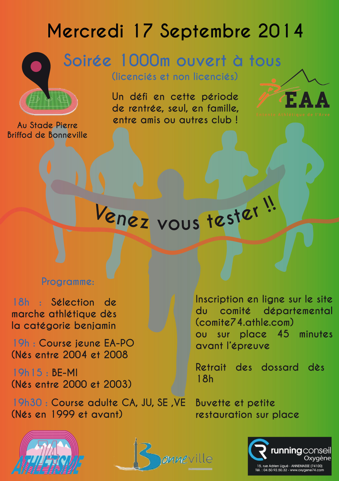 Le mercredi 17 septembre au stade Pierre Briffod à Bonneville, une soirée 1000 m ouverte aux licenciés et non licenciés, et cela à partir des écoles d’athlétisme et jusqu’à vétérans I, II, III IV, V… En ouverture à partir de 18h, de la marche athlétique au programme, une occasion de découvrir la discipline…
