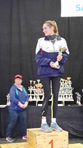 Nous avons donc Mathilde ALMERAS, première athlète sur la plus haute marche en marine et rose